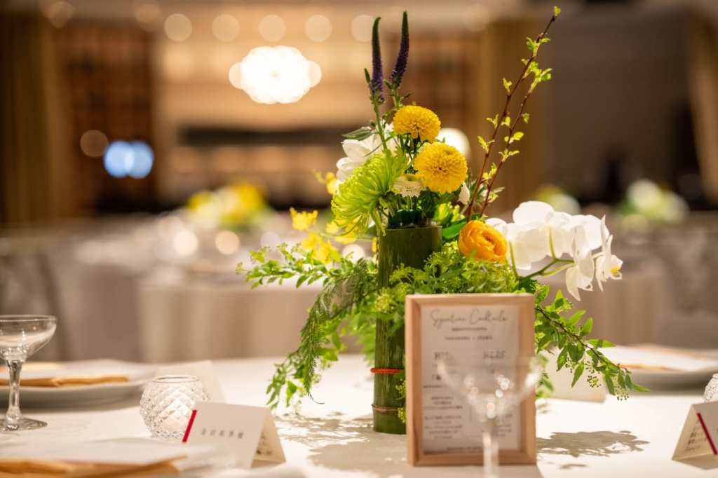 竹を使いイエローをアクセントにした装花も、とても好評でした。