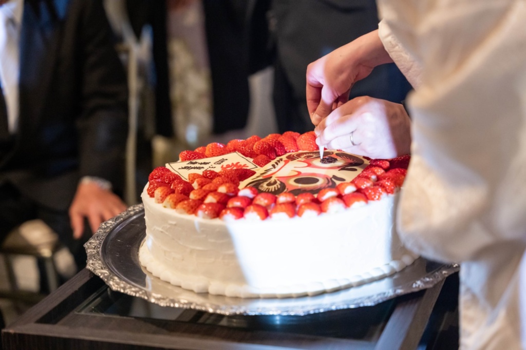 だるまのウェディングケーキが登場すると、ゲストの皆様がケーキの周りに集まってこられて、一斉にカメラを向けます。