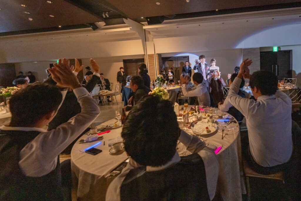受付で選んでいただいた色のサイリウムを、ゲスト全員で光らせて、ライブ会場のような雰囲気を作り、入場する新郎新婦様をお迎えしていただきました。