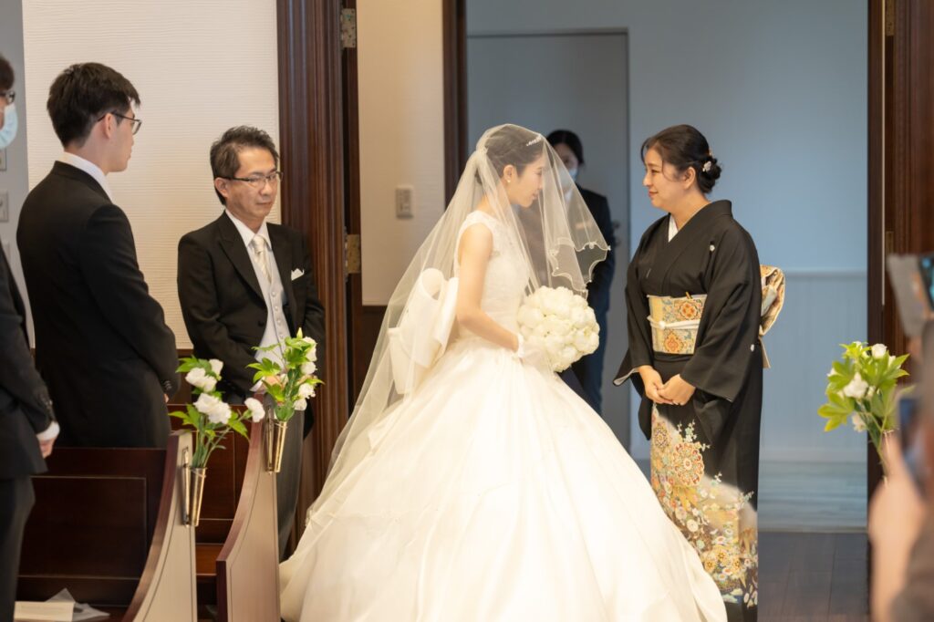 新婦様のご入場では、お母様からのベールダウン後、お父様としっかりと腕を組んでバージンロードを歩んでいかれました。